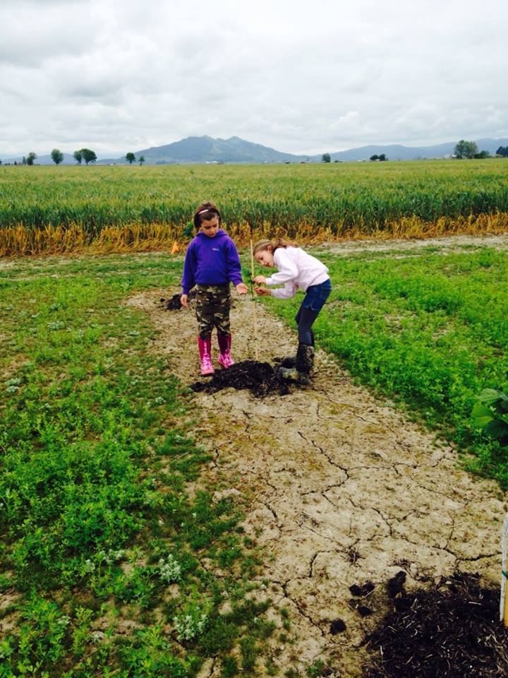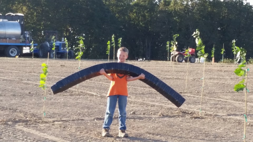 This smiling future farmer is George Dettwyler. He’s helping his dad, Karl, pick up pots from the planted trees before they blow away. The Dettwyler’s of Blue Line Farms, are a local farm in the Silverton, Oregon area.